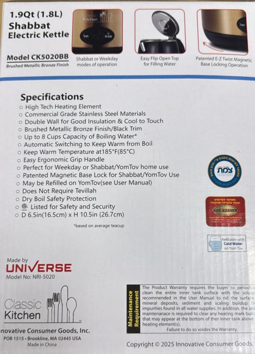 This dual-function electric kettle combines everyday convenience with Shabbat observance. The 1.9-quart capacity delivers ample hot water for tea, coffee, or cooking needs. Its Weekday/Shabbat design features a standard electric heating mode for daily use and a specialized Shabbat setting that maintains water temperature without active heating—ideal for those observing Jewish Sabbath laws. The kettle's efficient operation and thoughtful engineering make it an essential appliance for households seeking both modern functionality and religious accommodation. Perfect for families wanting a single, versatile solution.