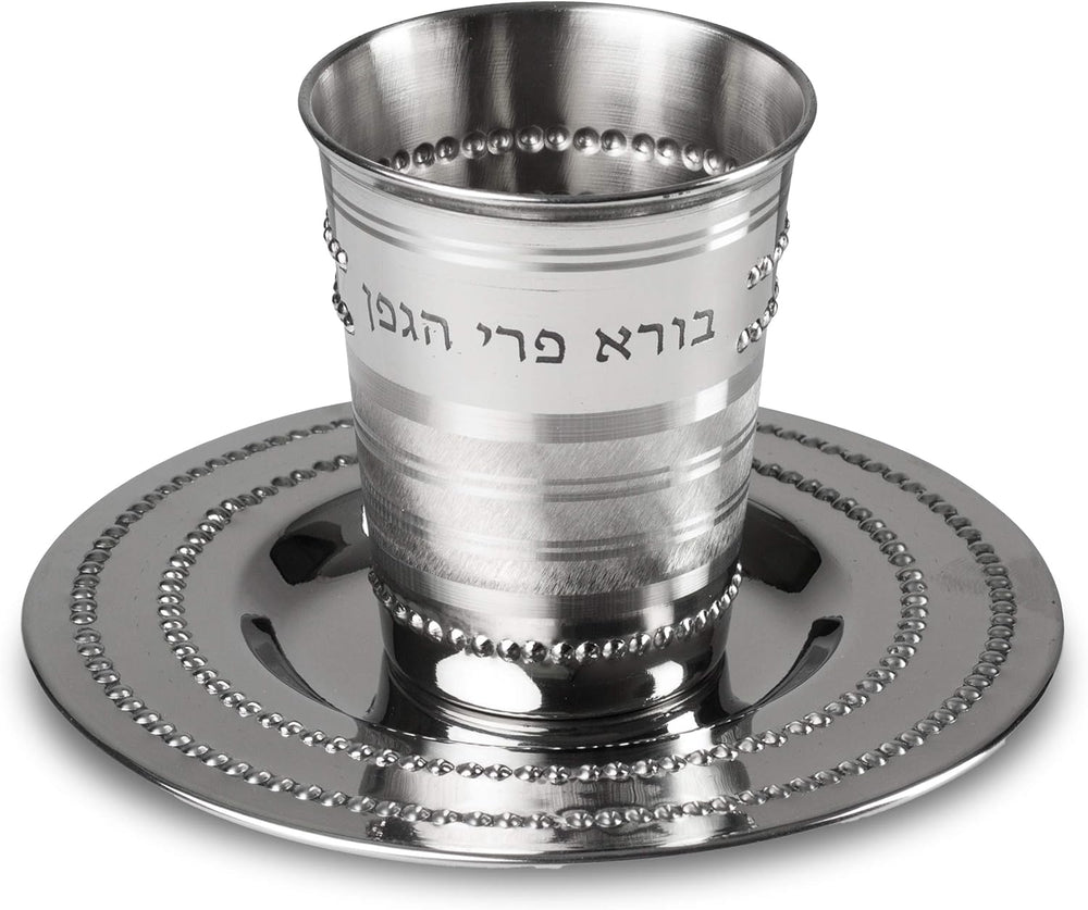 - MATCHING TRAY: This stunning kiddush cup comes with a matching Stainless Steel plated "saucer" tray which has a beautiful design around the edge, and a recessed middle for the wine to spill into. Using this kidush cup will leave no mess or wine spills at your table.